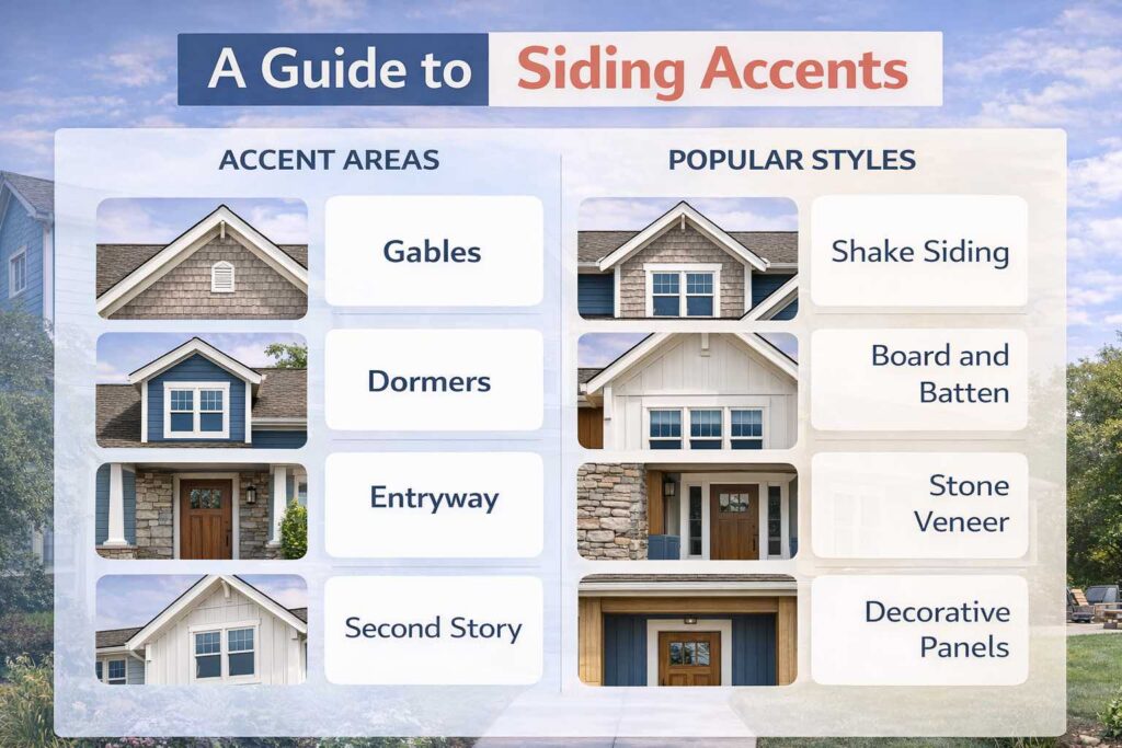 Siding accents are what take a home from standard to standout. While your primary siding sets the foundation, accents create contrast, highlight architectural features, and give your home a more custom, high-end look. When done right, they add depth, dimension, and personality without overwhelming the design.